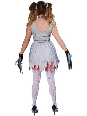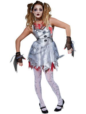 Dress up as this drop-dead gorgeous doll and play dead this Halloween! Try lying very still (as any of those spooky china dolls do), then scream or jump to your feet! Wrapped and strangled with barbed wire, you're the stuff of nightmares... Includes dress with barbed wire print and bloodied neck detail Shredded hem Glovelettes Barbed wire choker. Stockings and shoes not included.