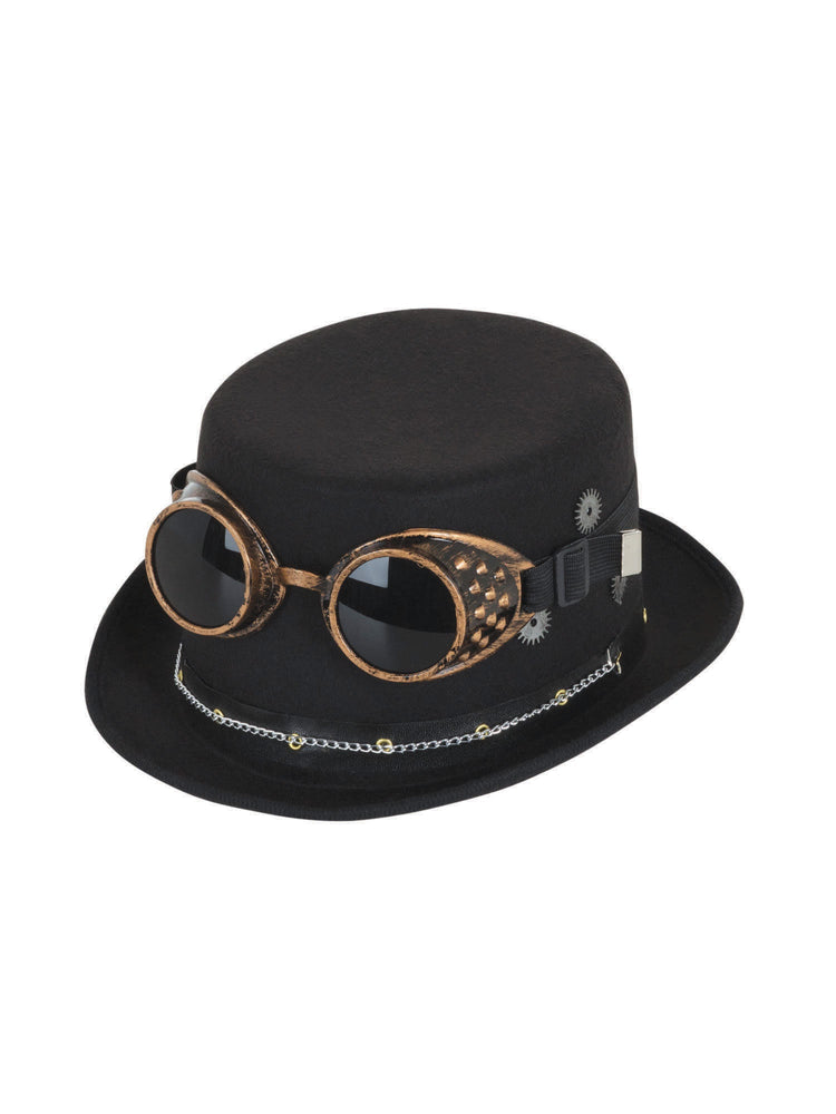 Top off your costume with this Black Steampunk Top Hat And Goggles/Gears from Rubies. Perfect for Halloween, Carnival, theme parties or just dressing up.