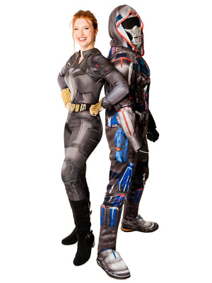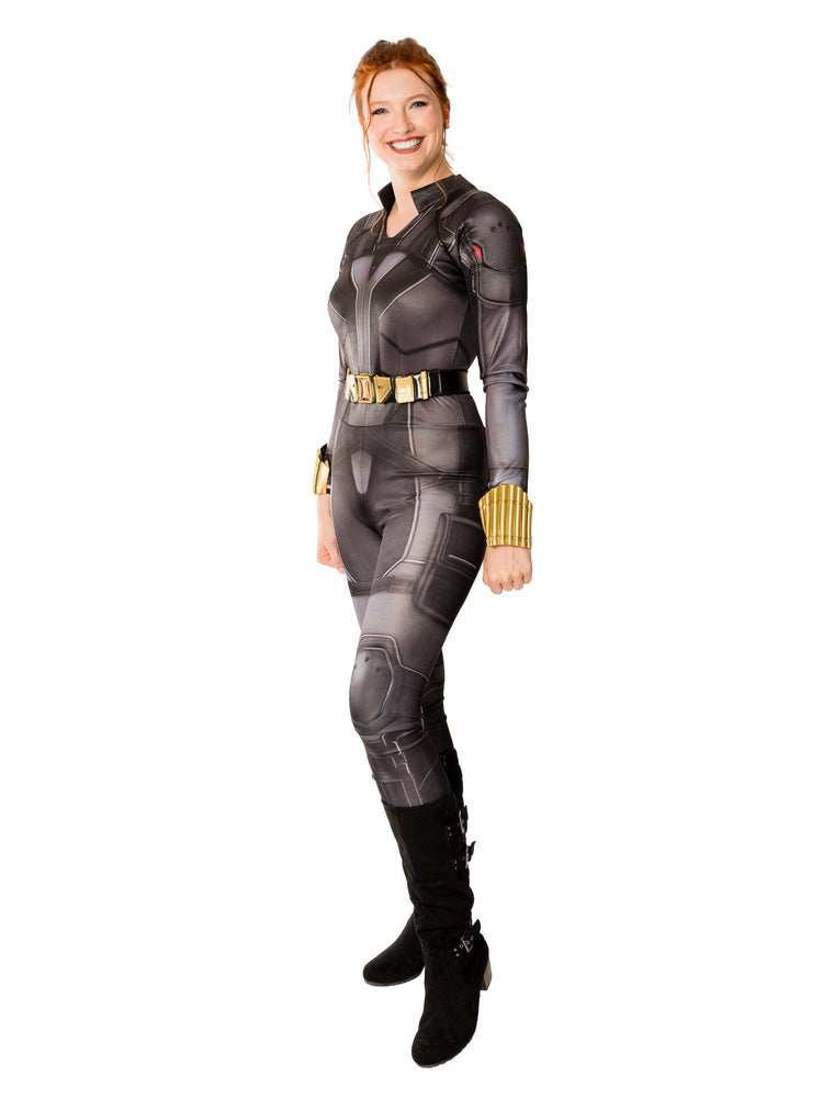 This deluxe Black Widow jumpsuit includes cuffs and belt.
