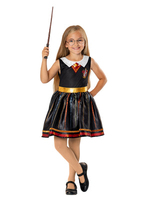 Ga je naar Zweinstein School of Witchcraft and Wizardry? Dan moet je gekleed zijn in het uniform dat alle leerlingen van de huizen Gryffindor, Slytherin, Ravenclaw en Hufflepuff dragen. Deze jurk is bedrukt in de stijl van het Hogwarts uniform met toverstokken over de hele rok, perfect voor alle jonge heksen.