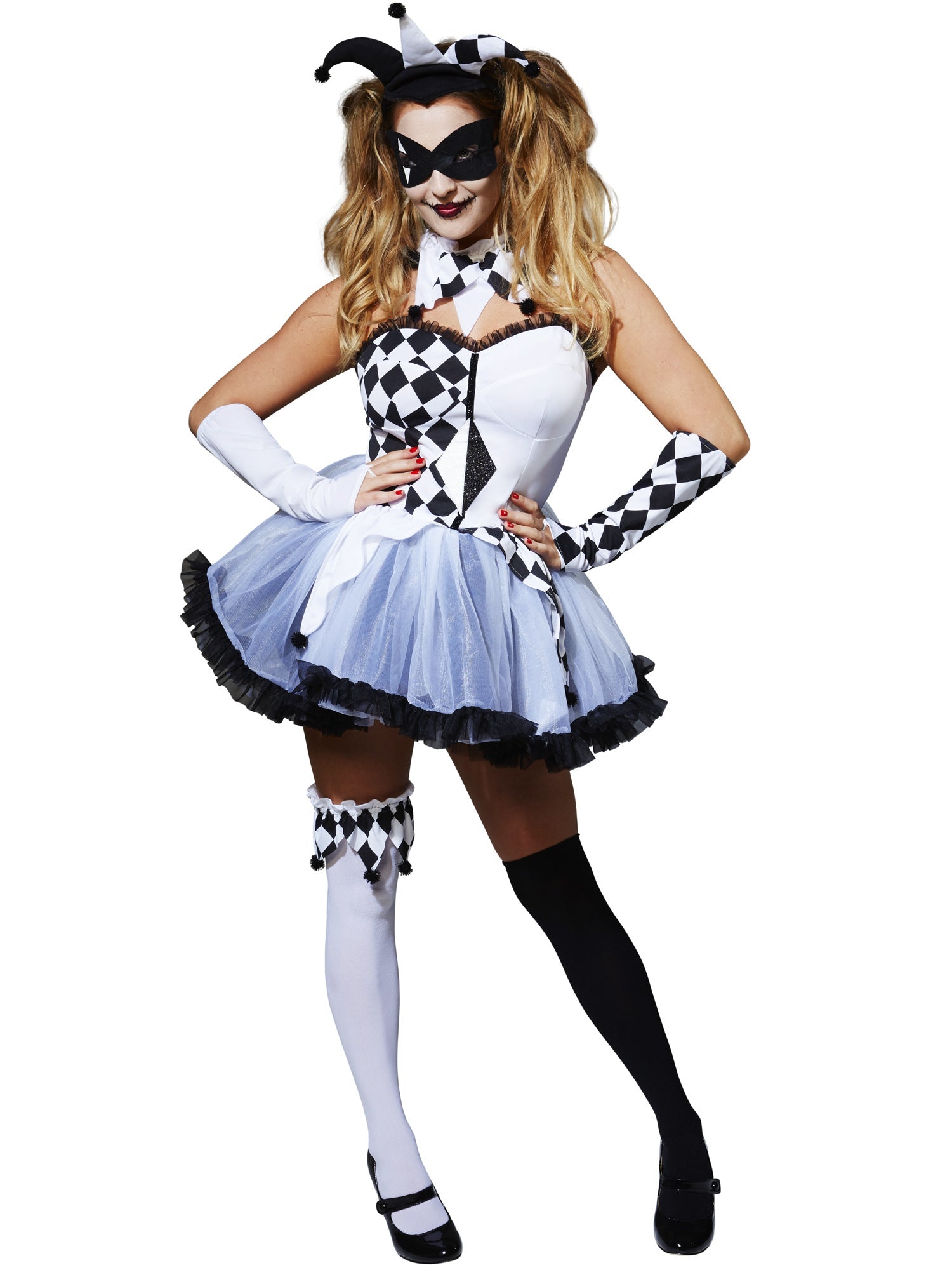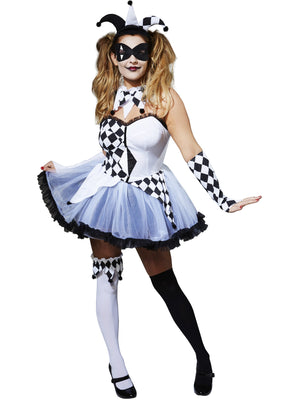 In the Kings Court you can play the Joker or the Fool just as they used to do in Medieval times. This cute Jester would be royally entertaining for Book Week, Book Fun Day or Halloween. Includes tutu dress with black and white cheques and tulle underlay plus fitted bodice, choker, glovelettes and garter are all matching in black and white cheques. Also comes with moulded felt eye mask with elastic strap and fibre filled jester headband with pom pom details.