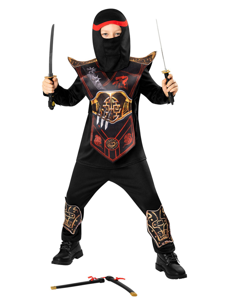 Top, trousers, foam overlay, elbow and knee pads and weapons (daggers, swords and throwing stars)