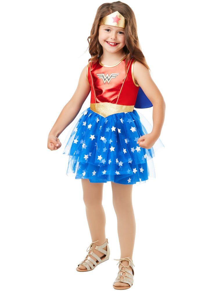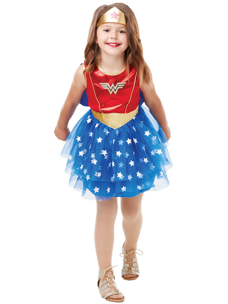 Wonder Woman is Princess Diana of Themyscira, but she adopts the civilian identity of Diana Prince in daily life. The DC Super-heroine from the Amazonian Jungle, she has super human strength and speed, and uses trusty weapons like her lasso of truth, her tiara and bullet-proof bracelets. She teams up with fellow heroes like Batman and Superman as part of the Justice League and takes on crime wherever it lurks. Portrayed as strong, sexy and smart, Wonder Woman has appeared in many Warner Bros movies as well as cartoons, TV series and video games. She is also a team member of the DC Superhero Girls along-side Batgirl, Supergirl and Harley Quinn. From the days of Lynda Carter on the small screen to Gal Gadot on the big screen in Batman Vs Superman: Dawn of Justice (2016), Wonder Woman (2017) and Justice League (2017). Includes dress with metallic looking bodice, shaped gold chest logo digitally printed in gold trim Skirt of dress has a satin underlay and tulle overlay with white stars plus shaped gold belt attached to dress Cape is satin with detachable hook and eye closure tabs at shoulders Metallic fabric tiara headpiece with elastic strap to fasten. Shoes not included This is an .