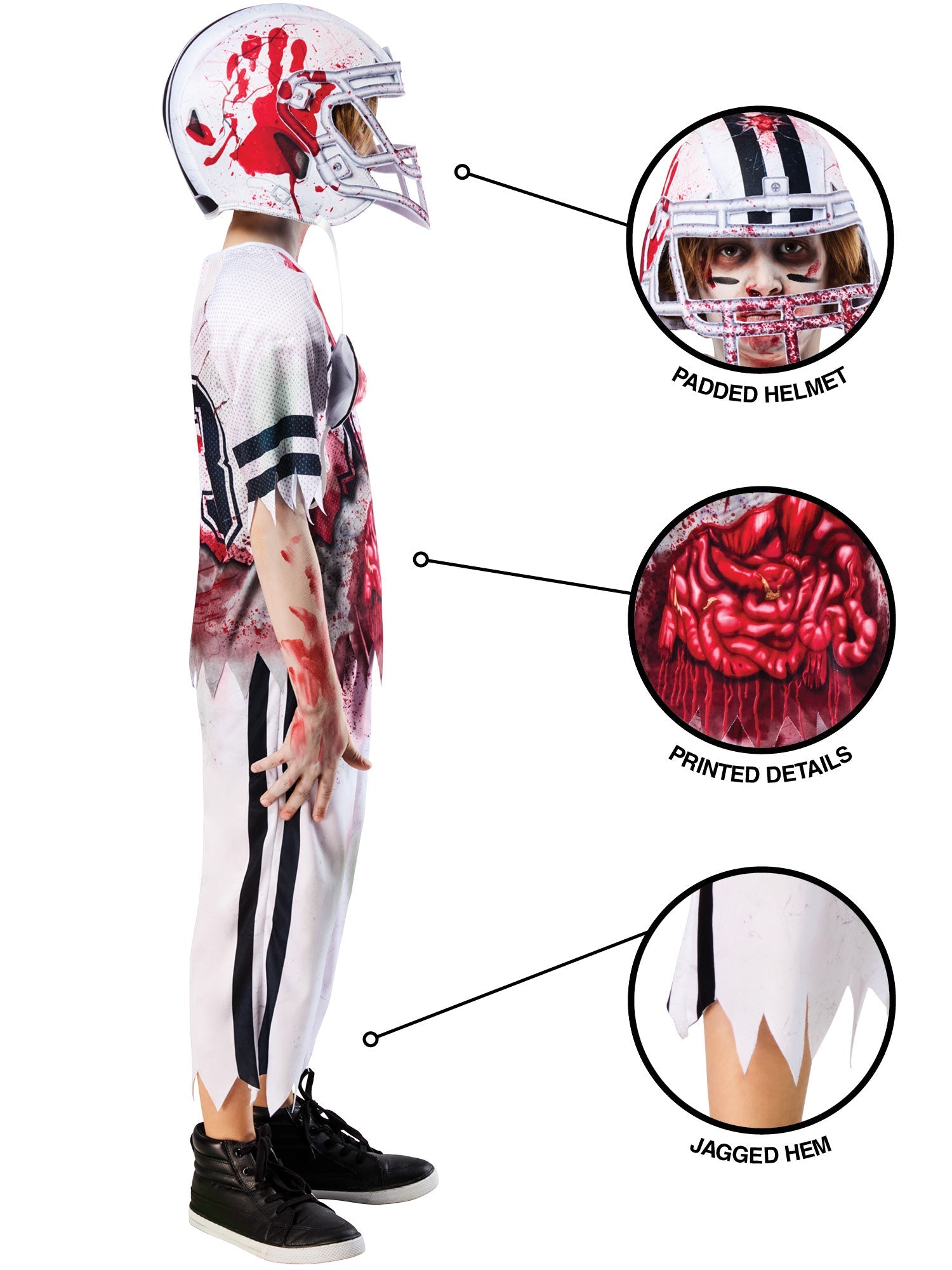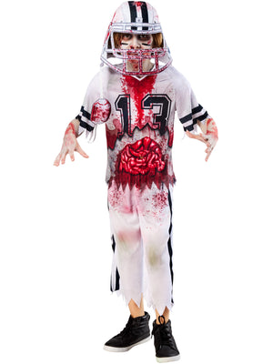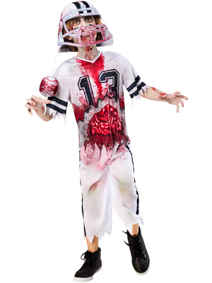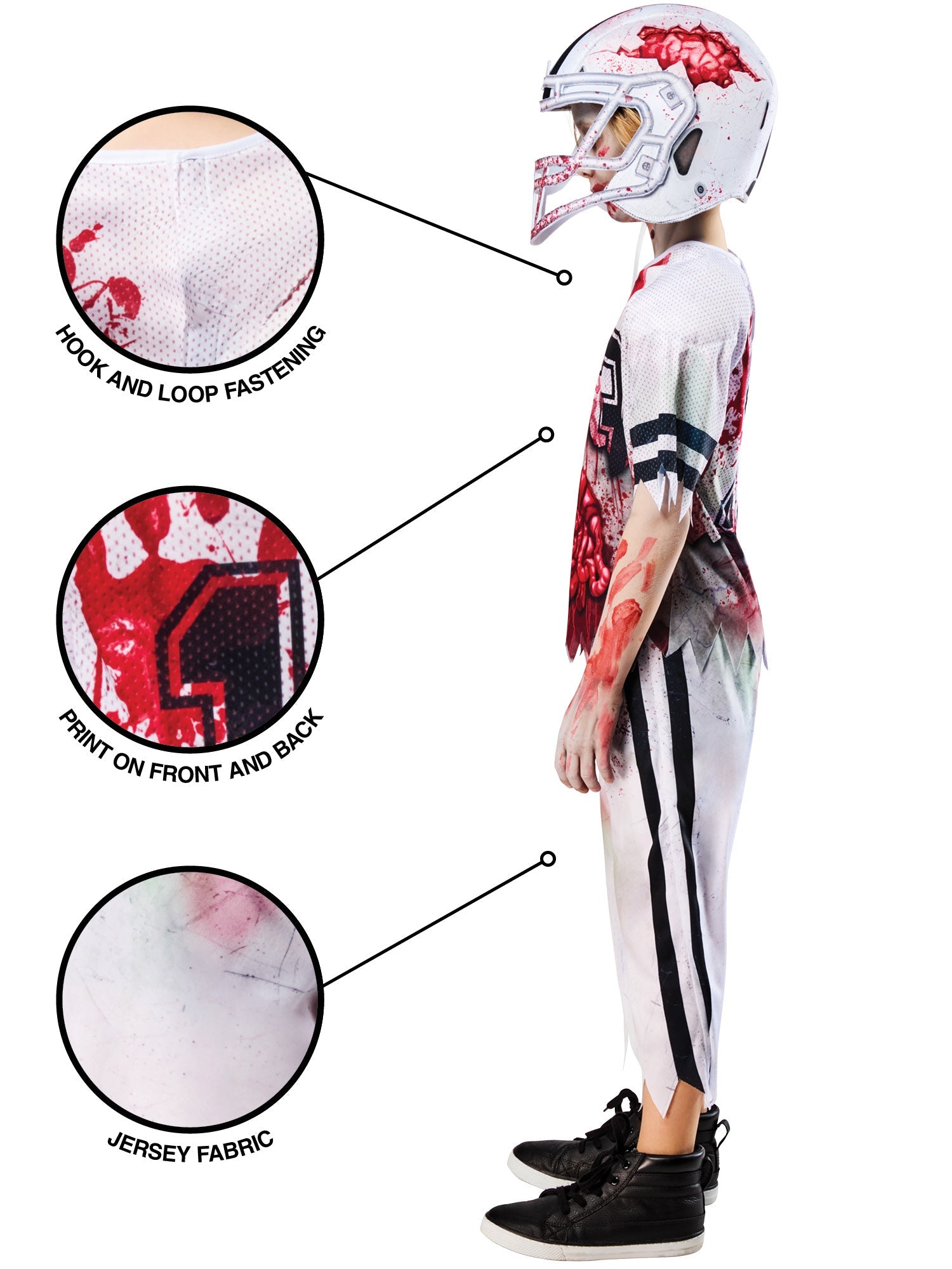 Score a touchdown in terror with this Zombie American Football Player costume! Tackle your friends' expectations as you lumber onto the field of fright, ready to play for Team Undead. Ideal for sports fans with a dark side or anyone looking to bring a bone-chilling twist to game day. Get ready to be the MVP of your next zombie apocalypse!