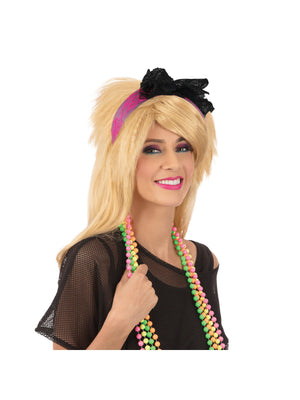 Top off your costume with this 80's Neon Lace Headband - Pink from Rubies. Perfect for Halloween, Carnival, theme parties or just dressing up.