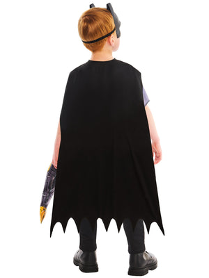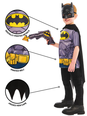 Transform into the Dark Knight with the Batman Dress Up Set! Featuring a cape, mask, inflatable grappling gun, and top, your young superhero can unleash their imagination and protect Gotham City as the Caped Crusader.