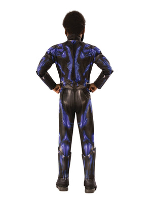 His real name is T'Challa, king and protector of the African nation Wakanda. With his cat-like instincts, Black Panther possesses super-human traits and senses. He is smart, cunning, scientific, and strong, and uses these abilities to combat evil. Originating in the Comics, and more recently played by Chadwick Boseman in the movies of the Marvel Cinematic Universe, Black Panther has clawed his way into that black suit, made out of vibranium, in many blockbuster movies. They include Captain America: Civil War (2016), Avenger's Infinity War (2018) and most recently in Avengers: Endgame (2019). In his self-titled movie of 2018, Black Panther fights the supervillain Eric Killmonger in a true cat fight! Includes Jumpsuit with lights in a digitally printed bodice on front and back, fibre filled muscle chest padding and stitching detail Full length sleeves with digital print and fibre filled muscle detail plus attached gauntlets Trousers with digital print on front and back, plus attached 3D boot tops Injection moulded light up mask with painted details