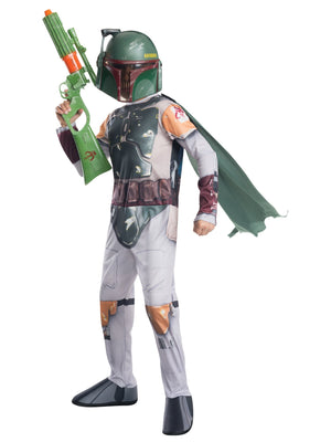 One of the greatest villains in the Star Wars Empire, Boba Fett, Bounty Hunter and cloned father of Jango Fett, is a true force to be reckoned with. Working for characters like Darth Vader and Jabba the Hut, he is one of the most feared bounty hunters in the galaxy. Known for his Mandalorian armour, deadly weaponry, and silent demeanour, he wreaks havoc in many Lucas Film Star Wars episodes, including A New Hope (1977), The Empire Strikes Back (1980), Return of the Jedi (1983), The Phantom Menace (1999), Attack of the Clones (2002), Revenge of the Sith (2005) and The Clone Wars (2008). Includes Digitally printed full-length jumpsuit with printed body armour, codpiece, belt, gauntlets and knee and shoulders pads. Jumpsuit features attached shoes covers with elastic strap to sit over shoes. also includes cape with scalloped edging and hook and eye closure at collar and full moulded plastic face mask with clear panel to see through and painted battle scrapes. Toy gun not included ..
