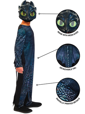 Soar above the mountains as the Toothless, the iconic dragon from the brand-new live action retelling of How to Train Your Dragon! With a high quality printed jumpsuit, attached wings, tail and a mask, this costume features lots of 3D features, perfect for taking to the skies as a dragon.