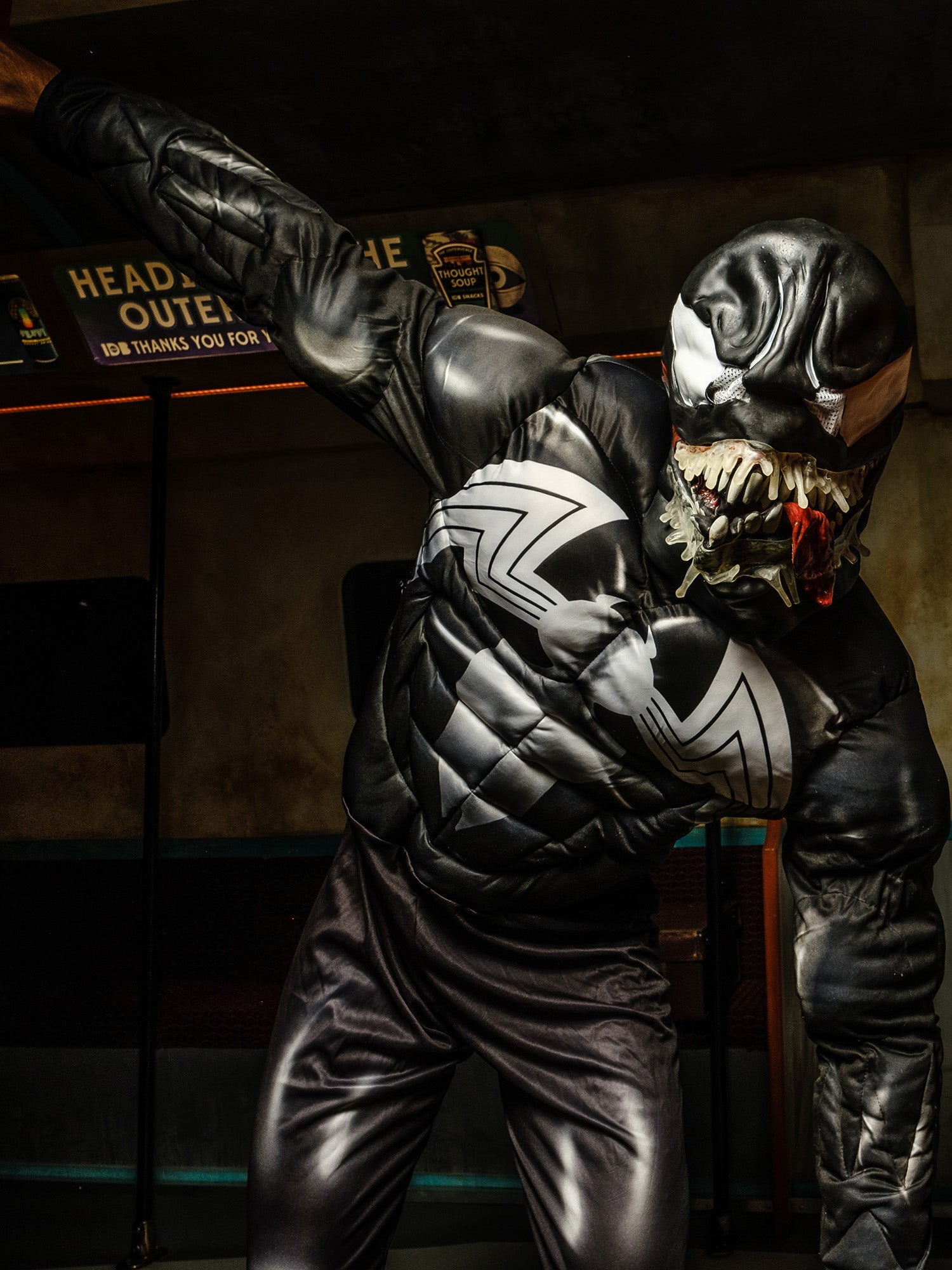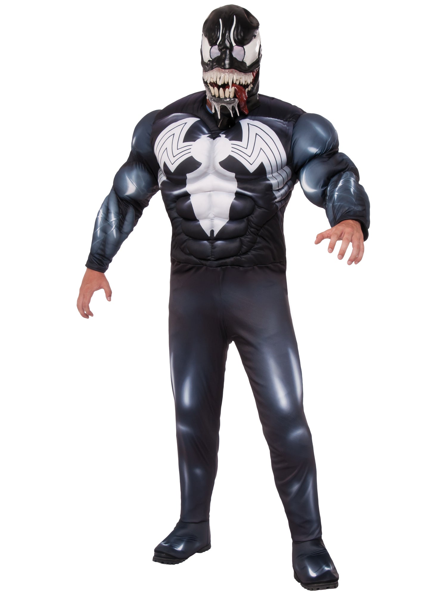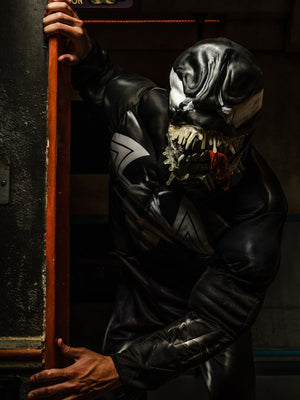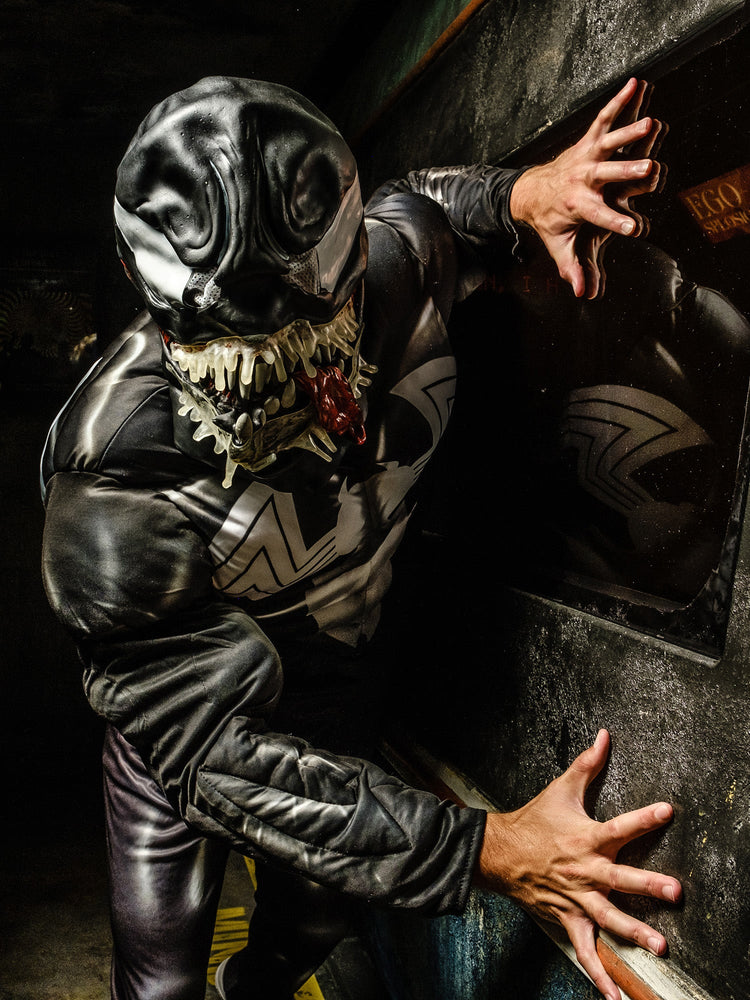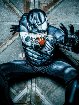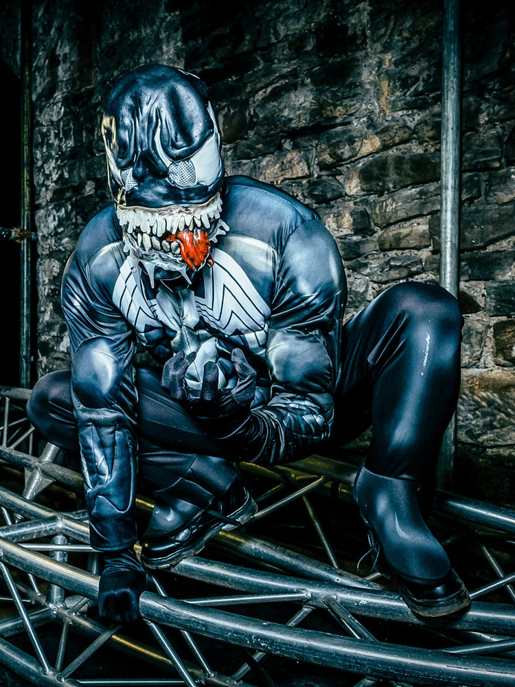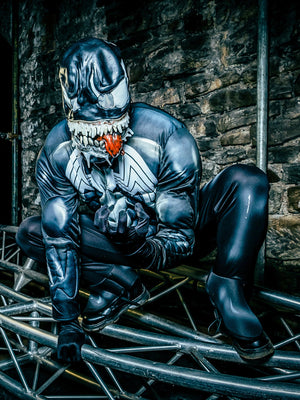 He is an evil shape-shifter. The black version of Spider-Man, Venom is an alien symbiote in the Marvel Universe, that requires a host to survive. He is known for his black suit and gnashing teeth. Includes jumpsuit with digitally printed bodice and fibre filled muscle chest with stitching detail Full length sleeves with digital print and fibre filled muscles with stitching details Pants with digital print and attached boot tops Moulded mask with painted details and elastic band with hook and eye closure fasten. .