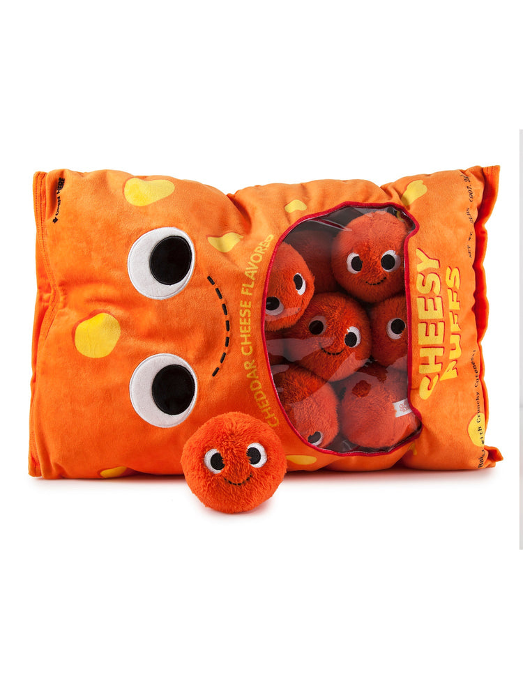Who needs sweet when you can have cheesy? Yummy World's best selling Arnold and The Puffs are here to add some savory flavors to Sprinkletree. Arnold and The Puffs Yummy World Cheesy Puffs Plush pack 24 inches of cheesy puff punch! This bag of everyone’s favorite crunchy cheesy snack comes stuffed with individual cheese puff plush balls with a crunchy (crinkle) surprise. Sink your teeth into this cheese puff stuffed animal pillow today and show off your cheesy side! Cheese puff ball amounts vary.